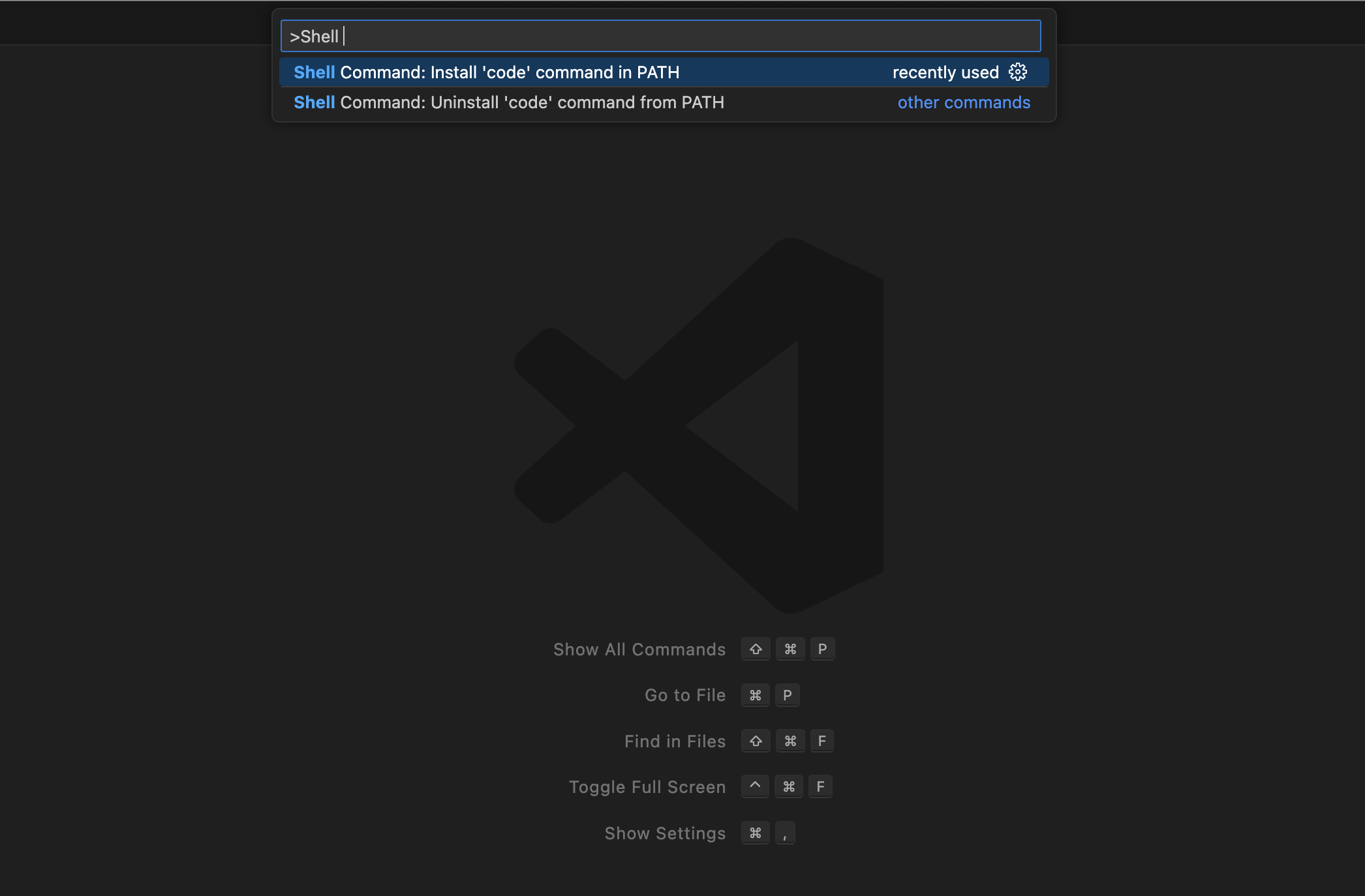 - "Shell Command: Install 'code' command in PATH"를 입력하고 실행합니다.