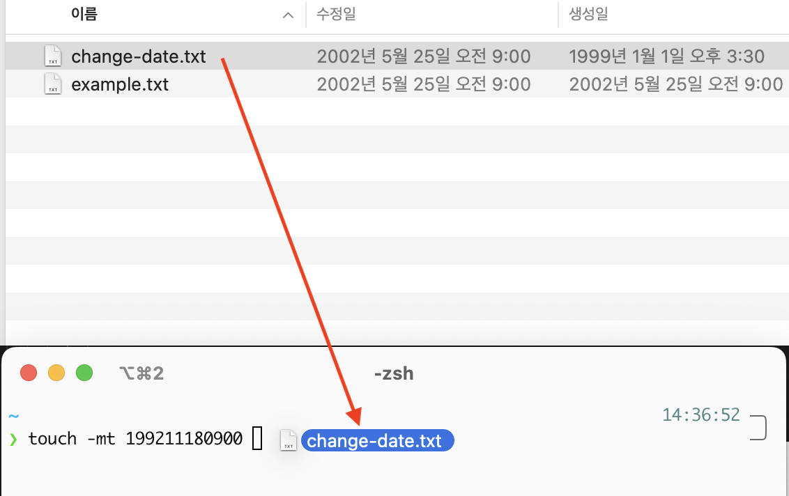 - 터미널에서 touch 명령어를 사용해 파일의 수정일을 간단히 변경할 수 있습니다.