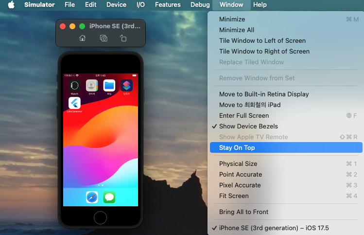 iOS 시뮬레이터에는 간단하게 창을 항상 맨 위에 고정할 수 있는 기능이 내장되어 있습니다. 이 기능을 사용하면 다른 작업을 하면서도 시뮬레이터 화면을 쉽게 볼 수 있습니다.