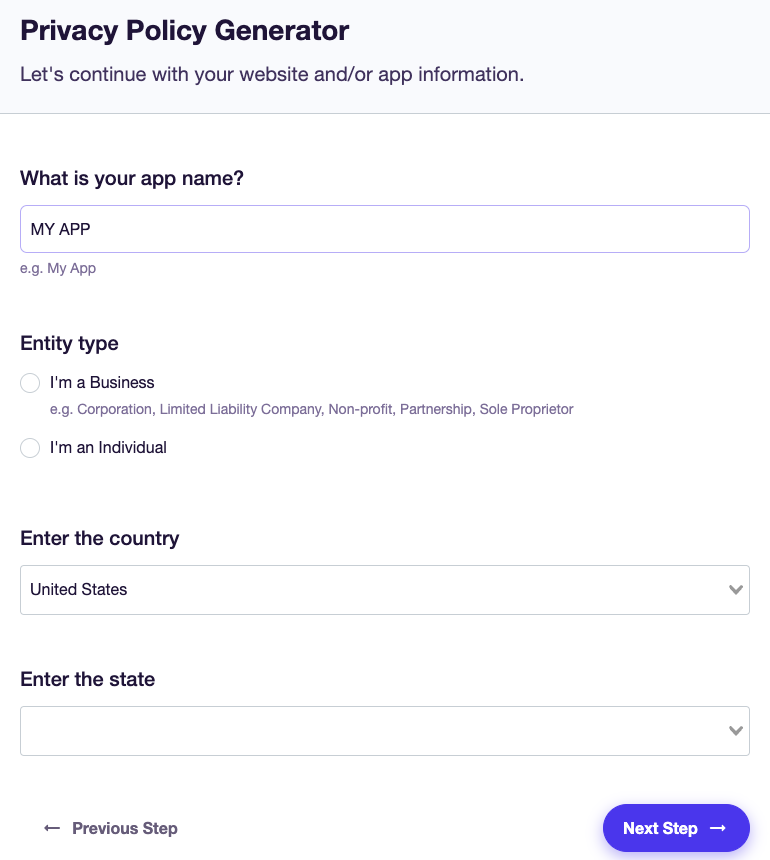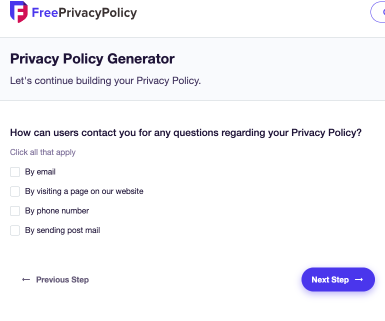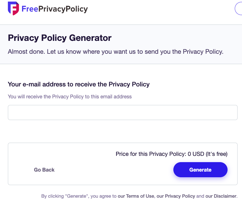 마지막 단계에서는 이메일 주소를 입력하여 생성된 개인정보 처리 방침을 받을 수 있습니다.