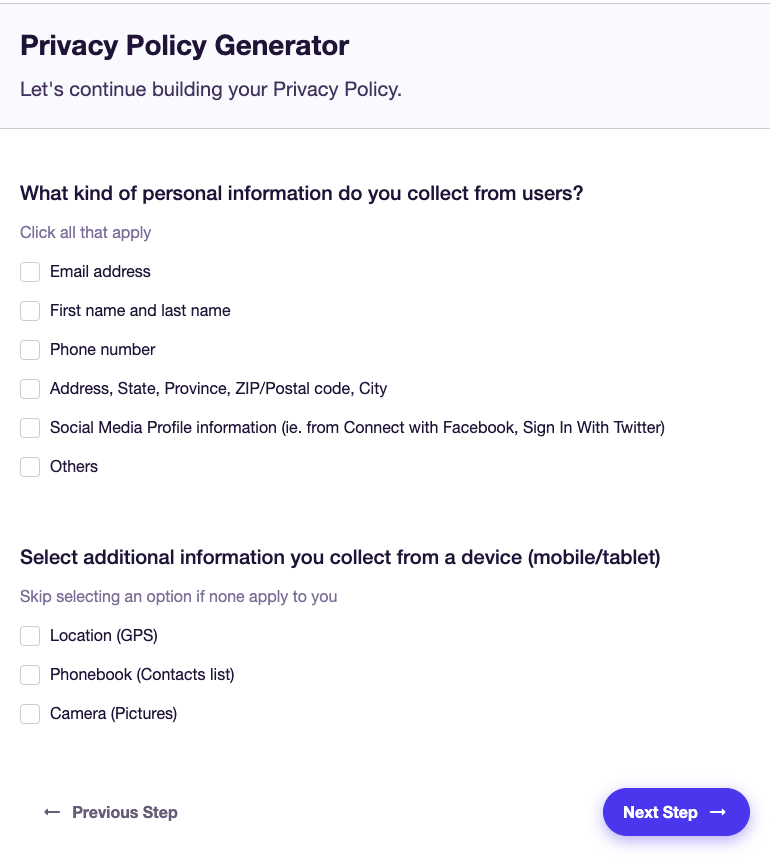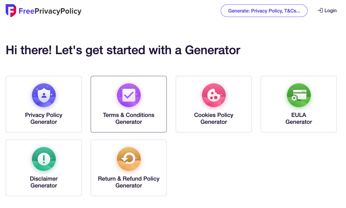 사이트에 접속하면 여러 가지 생성기 옵션이 제공됩니다. 여기서 개인정보 처리 방침을 생성하기 위해 첫 번째 옵션을 클릭합니다.