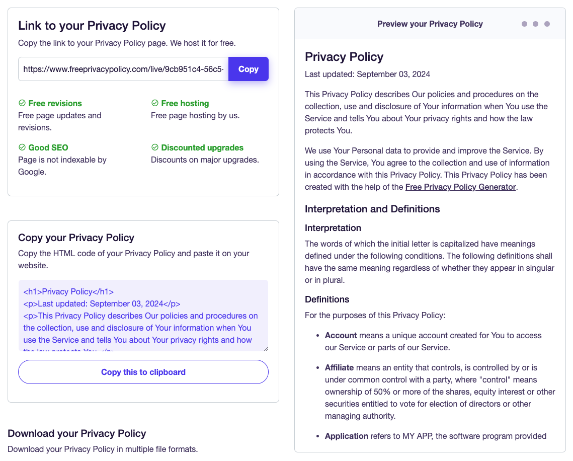 모든 작업이 끝나면 개인정보 처리 방침의 URL이 생성되며, HTML 코드, 다운로드, 미리보기(Preview) 옵션도 함께 제공됩니다. 이를 통해 다양한 방식으로 개인정보 처리 방침을 저장하고 활용할 수 있습니다.