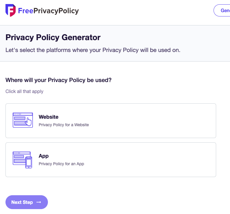 사이트에 접속하면 여러 가지 생성기 옵션이 제공됩니다. 여기서 개인정보 처리 방침을 생성하기 위해 첫 번째 옵션을 클릭합니다.